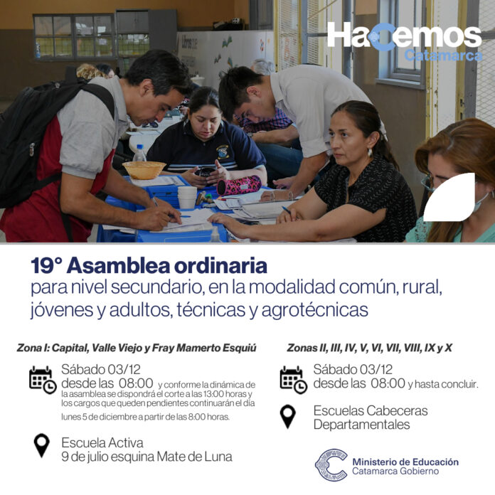 El Ministerio de Educación a través de la Secretaría de Gestión Educativa comunica que por Resolución SGE (ME) N° 147/2022 se autoriza la realización de la19° Asamblea ordinaria de opción para la cobertura de horas cátedra interinas y/o suplentes para las instituciones educativas del nivel secundario, en la modalidad común, rural, jóvenes y adultos, técnicas y agrotécnicas de gestión estatal pública para, Zona II: Capayán, Ambato y Paclín; Zona III: Santa María; Zona IV: Belén; Zona V: Pomán; Zona VI: Andalgalá, Zona VII: Tinogasta – Fiambalá, Zona VIII: Santa Rosa – El Alto, Zona IX: Ancasti y La Paz y Zona X: Antofagasta de la Sierra las que se llevarán a cabo el día sábado 3 de diciembre de 2022 en las Escuelas Cabeceras Departamentales habilitadas a partir de las 8:00 horas y hasta concluir.