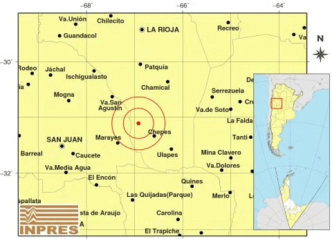 Epicentro: 158 km al E de San Juan; 189 km al S de La Rioja; 40 km al NO de Chepes -31.110 (lat) -66.920 (long)