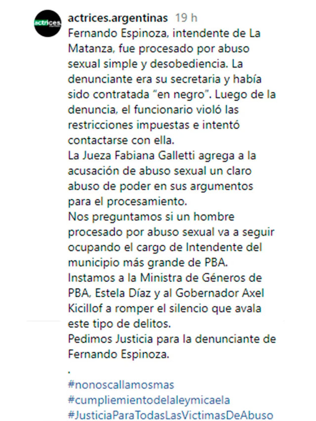 El colectivo Actrices Argentinas se manifestó sobre el procesamiento por abuso sexual y desobediencia del intendente de La Matanza, Fernando Espinoza.