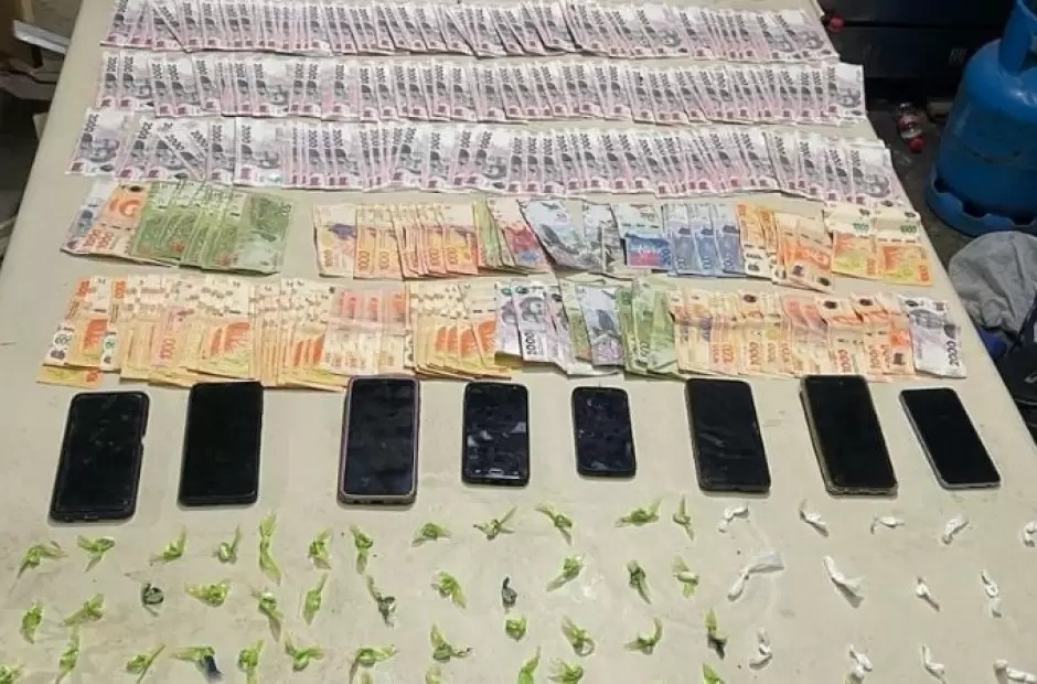 Conjuntamente con personal de la Dirección de Operaciones Especiales Kuntur, los investigadores encontraron envoltorios de plásticos que contenían marihuana y cocaína, aptas para preparar unas 150 dosis, varias pastillas de ansiolíticos, ocho teléfonos celulares de distintas marcas y modelos, dos balanzas digitales y más de medio millón de pesos en efectivo.