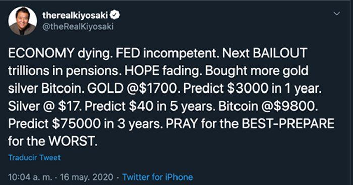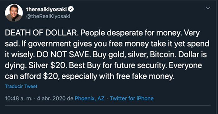 El autor de «Padre rico, padre pobre» Dad aprovecha sus 1,3 millones de seguidores en Twitter para intentar encender las alarmas en el mundo. Y desde el comienzo de la crisis mundial del Coronavirus, y la siguiente impresión de miles y miles de millones de dólares a todo el mundo, Robert Kiyosaki nos recomienda no ahorrar, y gastar todo nuestro dinero nacional ya sea comprando oro, plata o Bitcoin.