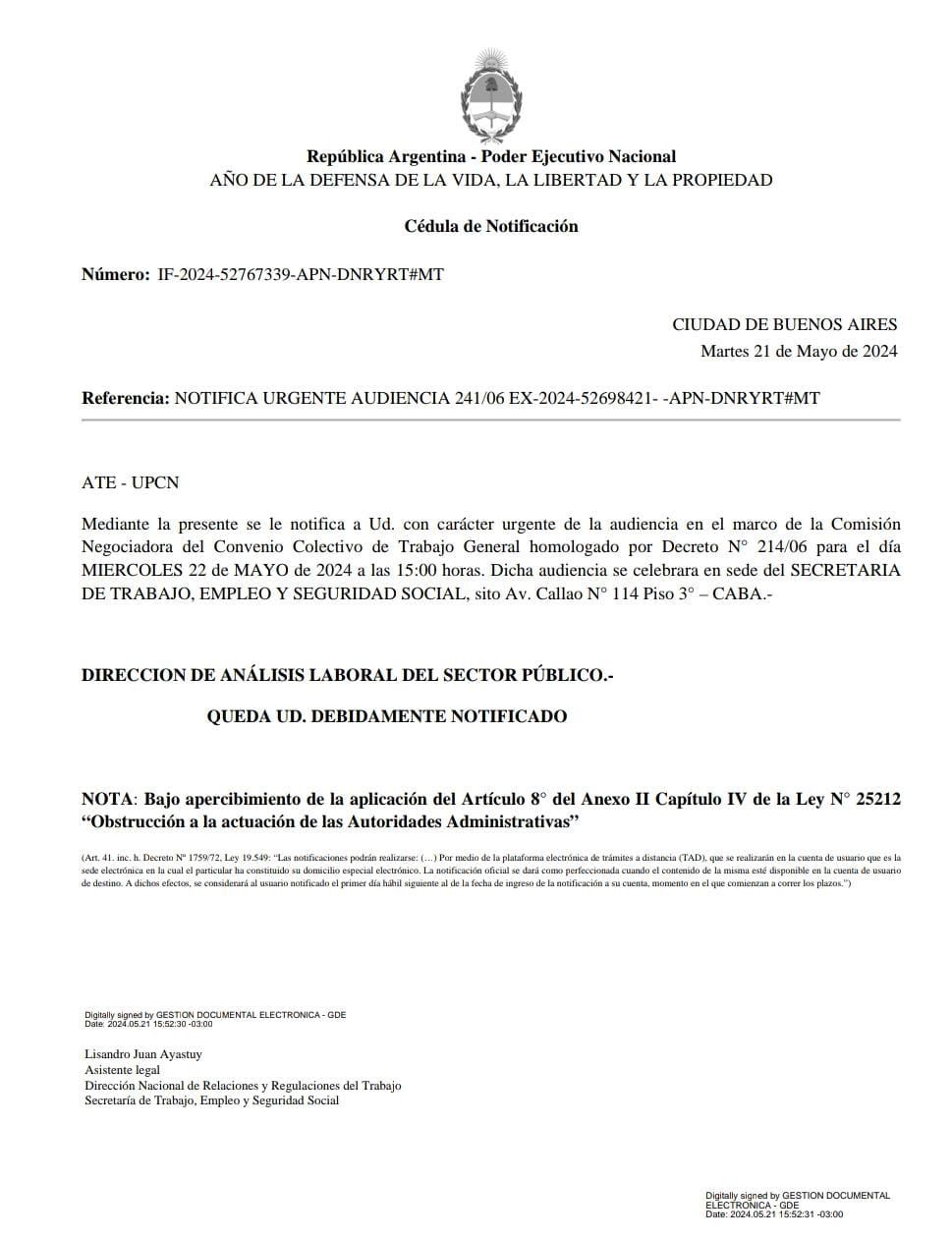 El Gobierno nacional convocó a paritarias para la Administración Pública Nacional para este miércoles a las 15 y ATE exigió que el Ejecutivo se presente con una oferta salarial que garantice una recomposición en un solo pago.
