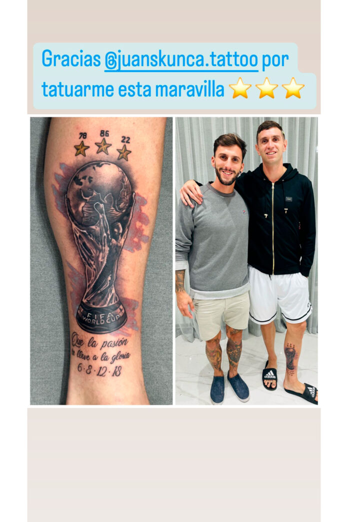 Como el propio portero se encargó de subir en sus redes sociales, se puede ver que en el diseño elegido, además de una imagen de gran tamaño del trofeo, también hay una frase que dice: “Que la pasión te lleve a la gloria”. Junto a eso, por debajo de la copa que tiene las tres estrellas con los respectivos años de las conquistas, se sumó una secuencia de números. “6, 8, 12 y 18″, fueron los elegidos por Martínez para sumar en su pierna izquierda.