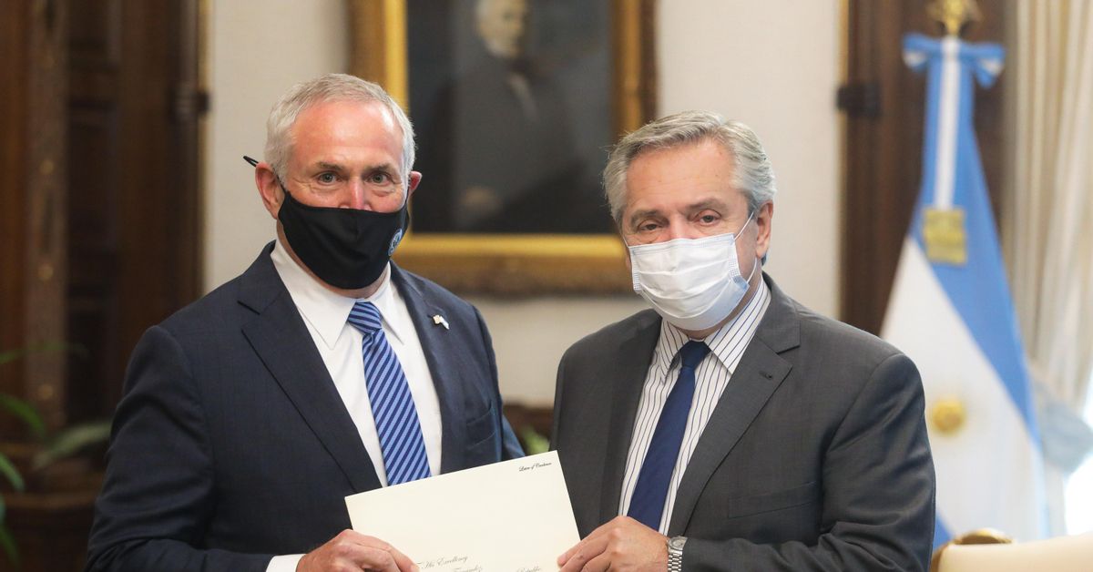 El presidente Alberto Fernández recibió hoy en Casa Rosada las cartas credenciales del nuevo embajador de Estados Unidos en Argentina, Marc R. Stanley, con quien mantuvo además una reunión de trabajo que el diplomático consideró «excelente».