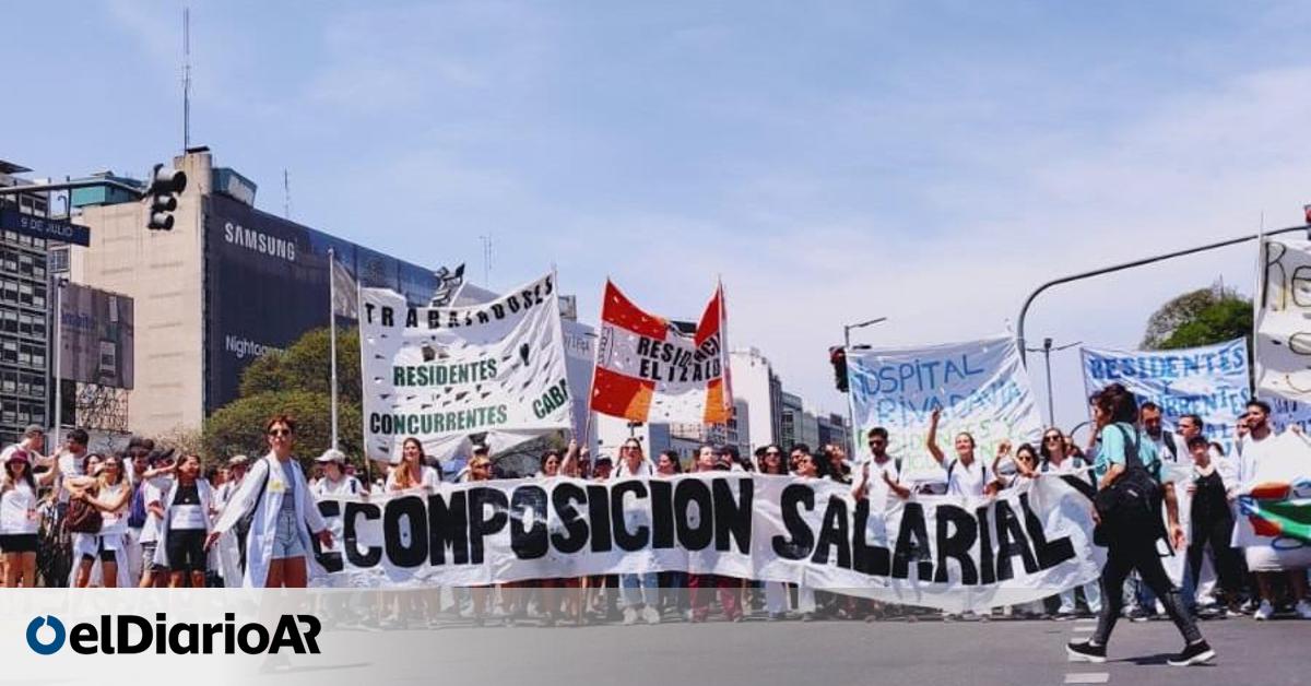 “Recomposición salarial ¡YA!”, se lee en el cartel que se extiende por la Avenida 9 de Julio a la altura del Obelisco. Lo sostienen médicos y médicas que en la mañana calurosa del último viernes de octubre ya llevan más de doce paros y movilizaciones. Son residentes y concurrentes de la Ciudad de Buenos Aires que desde hace siete semanas le reclaman al gobierno de Horacio Rodríguez Larreta aumento de sueldos, además de salario y ART para los concurrentes que hacen sus tareas de manera gratuita.