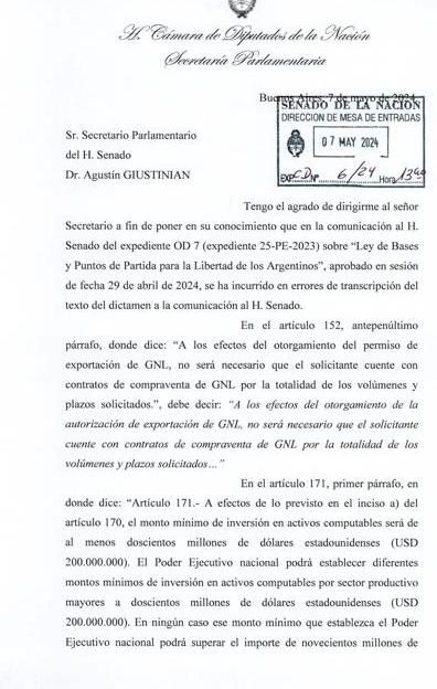 La aclaración oficial fue enviada al secretario parlamentario del Senado, Agustín Giustinian, por su par de Diputados, Tomas Figueroa. Allí se afirma que “se ha incurrido en errores de transcripción del texto del dictamen a la comunicación al H. Senado”. En concreto hubo modificaciones en los artículos 152 y 171, el primero sobre los permisos de exportación de gas natural licuado; el segundo sobre el ya polémico régimen de inversión RIGI.