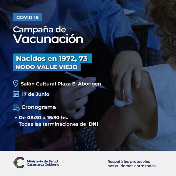 La Campaña de Vacunación COVID-19 continuará este jueves 17 de junio en los nodos Predio Ferial (nacidos en 1976 residentes en Capital), Valle Viejo, Belén, Andalgalá, Recreo, Bañado de Ovanta y Paclín. Cronograma completo!