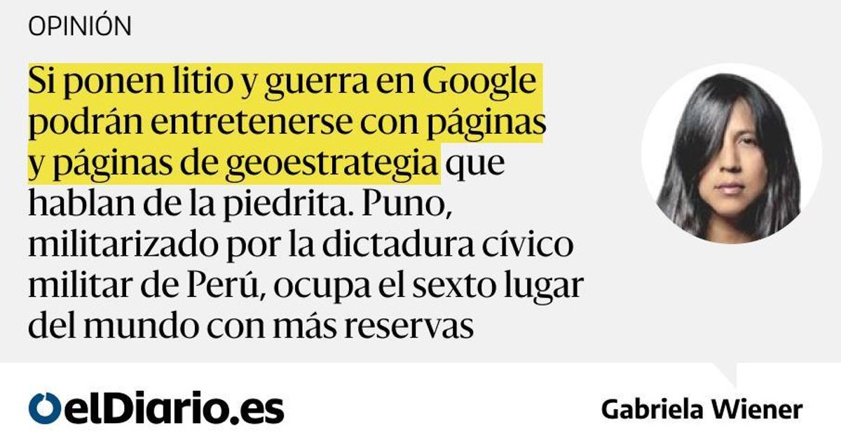 Ya lo dijo Lourdes Huanca en una entrevista en este elDiario.es: “Hay litio en Puno. ¿Creen que vamos a decir, ven aquí sácalo todo?” Las peruanas y peruanos en los territorios saqueados por multinacionales y por sus gobiernos están hartos de que el país se venda en pedacitos a millones de dólares y que ellos sigan en la pobreza y enfermando y muriendo por la contaminación, como está pasando con la tierra y el agua. Que mi país, ahora en llamas, sea de los más ricos productores de gas y que la gente del sur, de donde se extrae, siga muriendo de frío porque apenas puede encender una leña es inaceptable. Que cientos de niños mueran al año por las heladas en Puno es la deshumanización. Que el litio del Perú no se quede en el Perú para su propia energía renovable es un crimen. Que estén matando gente porque quieren cambios en las reglas de juego es fascista. El litio es clave para la apuesta global por las energías renovables. Ok, pero ya sabemos a quiénes les tocará el lado maníaco y a quiénes el represivo.