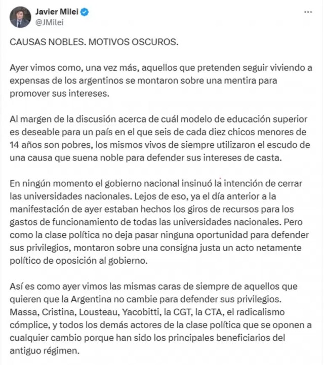 “Ayer vimos cómo, una vez más, aquellos que pretenden seguir viviendo a expensas de los argentinos se montaron sobre una mentira para promover sus intereses. Al margen de la discusión acerca de cuál modelo de educación superior es deseable para un país en el que seis de cada diez chicos menores de 14 años son pobres, los mismos vivos de siempre utilizaron el escudo de una causa que suena noble para defender sus intereses de casta”, escribió Milei.