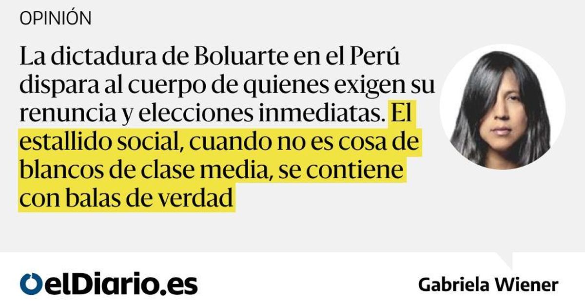 En el Perú estamos muy lejos de la paz. 17 personas fueron asesinadas por la policía en Puno, en la zona del altiplano, al sur del país. Ya van más de 46 muertos, entre ellos varios menores de edad, en el mes que lleva en el poder Dina Boluarte, colocada por el Congreso de la República para que sea útil a sus fines antidemocráticos. Aquí también, como ya ocurrió en Ecuador, en Colombia, en Bolivia, la lucha de los pueblos andinos, afrodescendientes, originarios, despierta el lado más fascista del poder. Y el estallido social, cuando no es cosa de blancos de clase media, se contiene con balas de verdad e impunidad. Dictadura y racismo van de la mano.