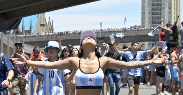 El campeonato es un carnaval y los invitados llegan de todos lados. Caminar hacia el sur de la 9 de Julio y no parar de cruzar gente de enfrente. “¿Nos subimos ahí?”, se preguntan en un grupo de amigos. “No, no, que es de vidrio”, los rescata uno. Pero todos los techos del Metrobus están copados. Solo en uno se pueden contar catorce pares de piernas colgadas.