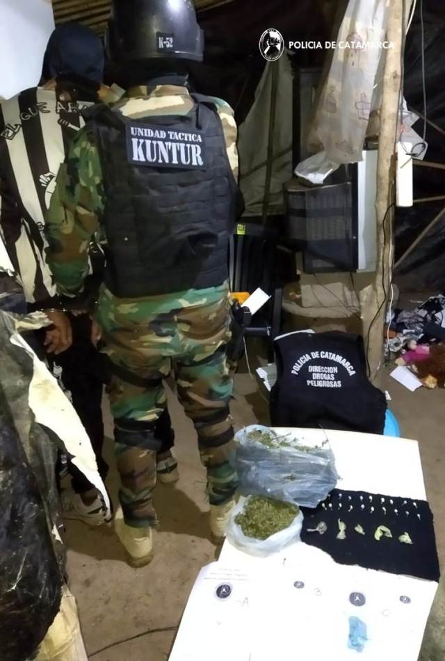 Siguiendo las instrucciones del Juzgado Federal, se procedió a la detención del sospechoso. Posteriormente, en colaboración con la Dirección de Operaciones Especiales Kuntur y la Comisaría Los Altos, se realizaron cuatro allanamientos en domicilios del barrio Las Parcelas, donde se encontraron más sustancias prohibidas. Los resultados de las pruebas de campo revelaron que se confiscaron 1,638 kg de marihuana, suficiente para unas 6.552 dosis, así como cocaína. Además, se incautó un teléfono celular Samsung.