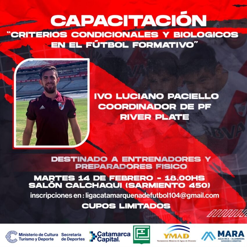 Este martes 14 de febrero a las 18 horas en el Salón Calchaquí (calle Sarmiento 450), el coordinador de PF de divisiones formativas de River Plate, Ivo Luciano Paciello, dictará una capacitación sobre «Criterios condicionales y biológicos en el fútbol formativo».