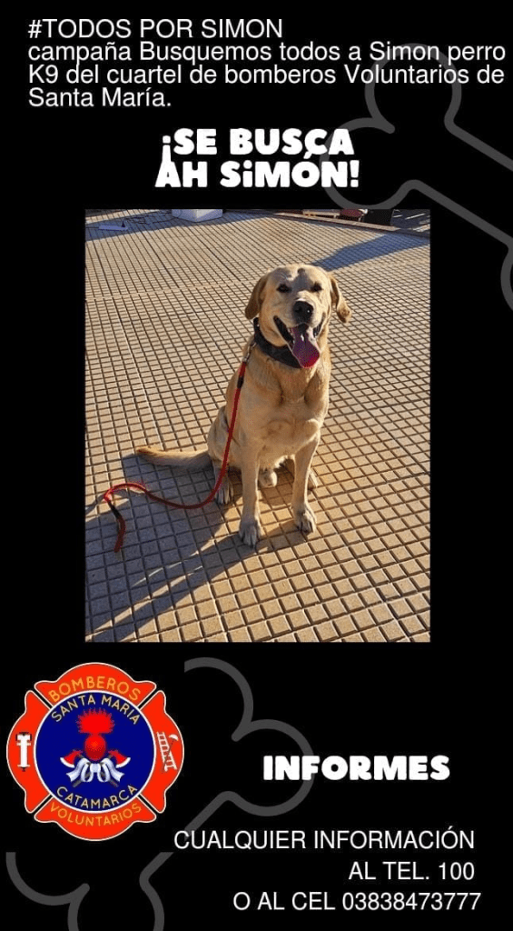 Se trata de Simón, un labrador perteneciente al cuerpo de Bomberos Voluntarios de Santa María, que estaba adiestrado para búsqueda de personas, y habría sido sustraído el pasado 22 de mayo.