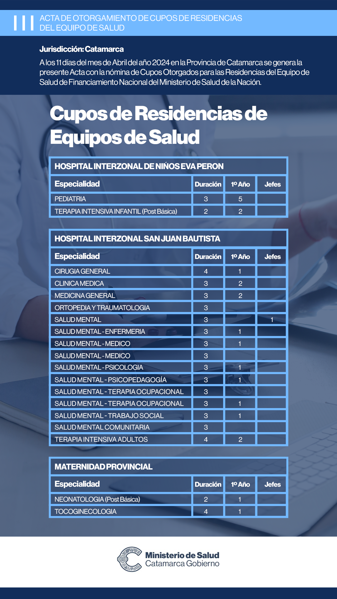 – Hospital Interzonal San Juan Bautista: Cirugía General, 1 cupo. Clínica Médica, 2 cupos. Medicina General, 2 cupos. Salud Mental, 1 cupo. Salud Mental Enfermería, 1 cupo. Salud Mental Médico, 1 cupo. Salud Mental Psicología, 1 cupo. Salud Mental Psicopedagogía, 1 cupo. Salud Mental Terapia Ocupacional, 1 cupo. Salud Mental Trabajo Social, 1 cupo. Terapia Intensiva Adultos, 2 cupos.