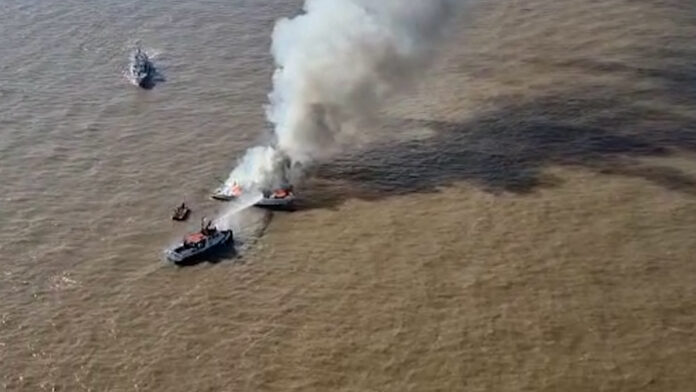 Minutos más tarde, un helicóptero de la Fuerza, con nadadores de rescate a bordo y guardacostas, comenzaron a operar en el área para iniciar las tareas de contención de las llamas.