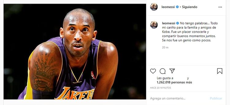 “No tengo palabras… Todo mi cariño para la familia y amigos de Kobe. Fue un placer conocerle y compartir buenos momentos juntos. Se nos fue un genio como pocos”, escribió el rosarino.