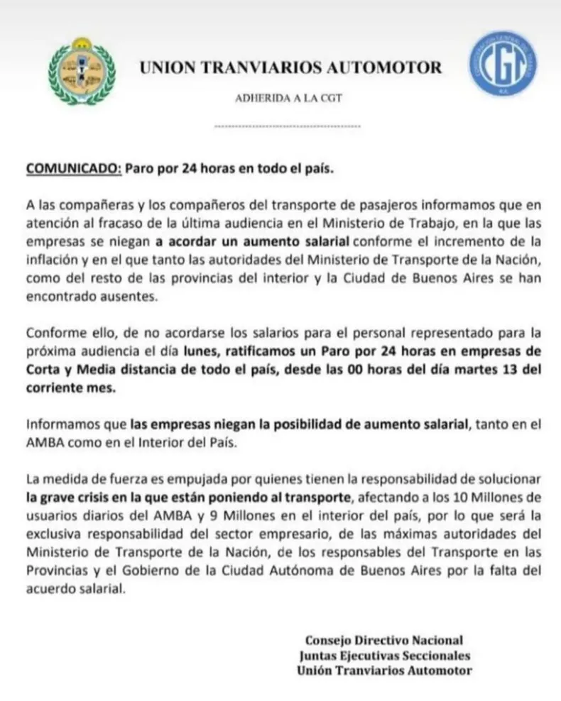 En un comunicado oficial por parte de la Unión Tranviarios Automotor explica que «la medida de fuerza es empujada por quienes tienen la responsabilidad de solucionar la grave crisis en la que están poniendo al transporte, afectando a los 10 millones de usuarios del AMBA y 8 millones en el interior del país, por lo que será exclusiva responsabilidad del sector empresario, de las máximas autoridades del Ministerio de Transporte de la Nación»