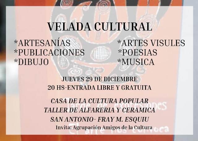 Este jueves 29 de diciembre, a partir de las 20, se realizará una muestra de artes visuales, publicaciones, poesía y artesanías que tendrá como protagonistas a reconocidos exponentes como Raúl Guzmán, Celeste Moya, Adriana Lobo, Oscar Quintero, Guillermina Zárate, Néstor Lagoria, Sergio Viñovezky, Rosa Jalile, Juan José Serra, Julio Herrera, Oscar Alaníz, Hilda García, Mario Daniel Vera, Estefanía Herrera, Biblioteca Popular “Juana Rosa Ahumada”, artesanos del Taller de Cerámica de San Antonio, entre otros.