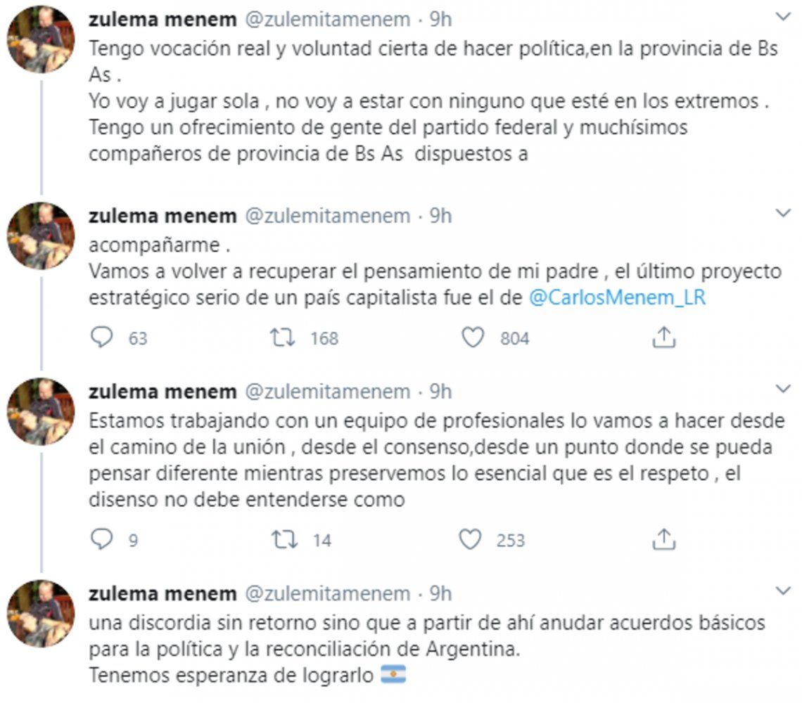 “Yo voy a jugar sola, no voy a estar conninguno que esté en los extremos. Tengo un ofrecimiento de gente del Partido Federal y muchísimos compañeros de provincia de Buenos Aires dispuestos a acompañarme”, relató.